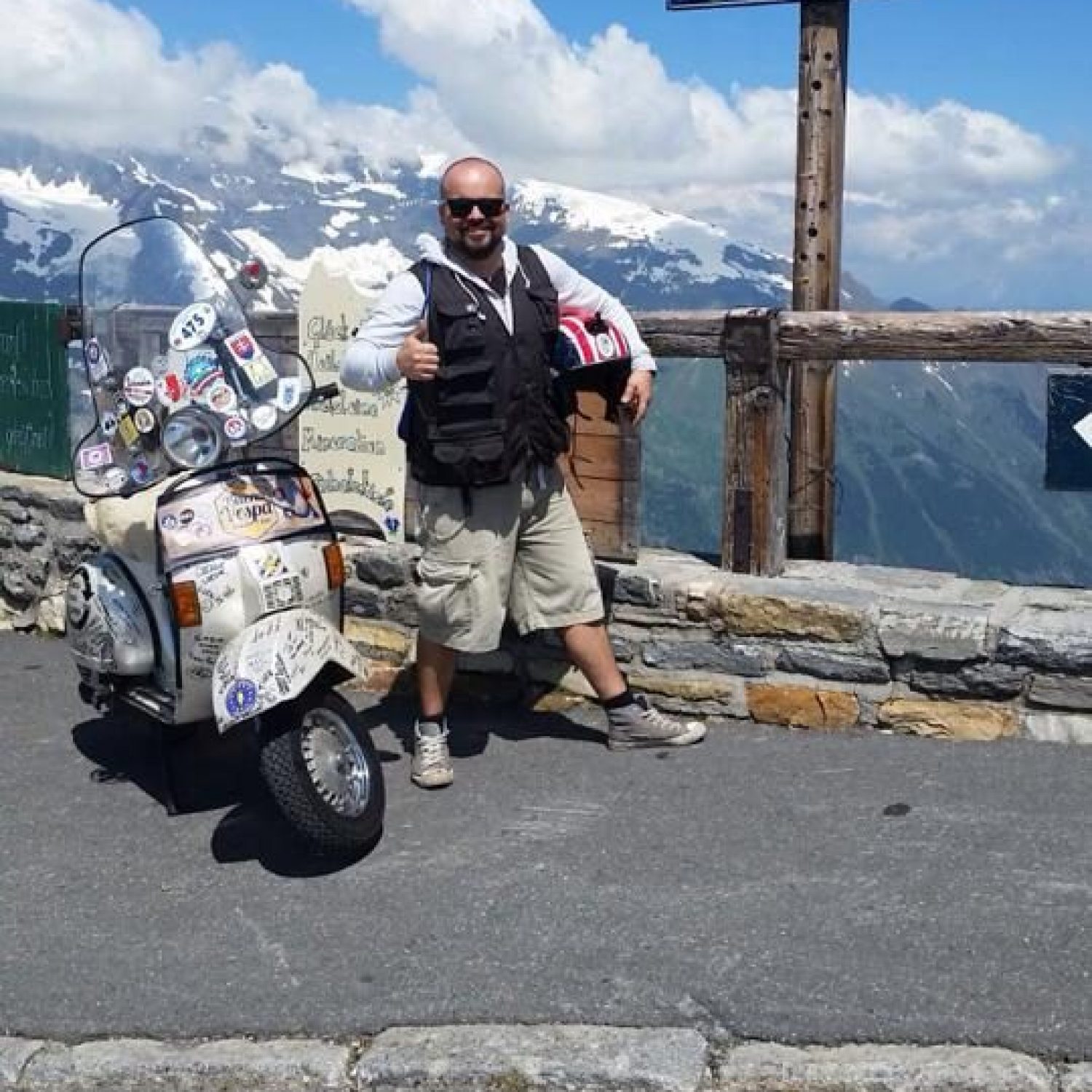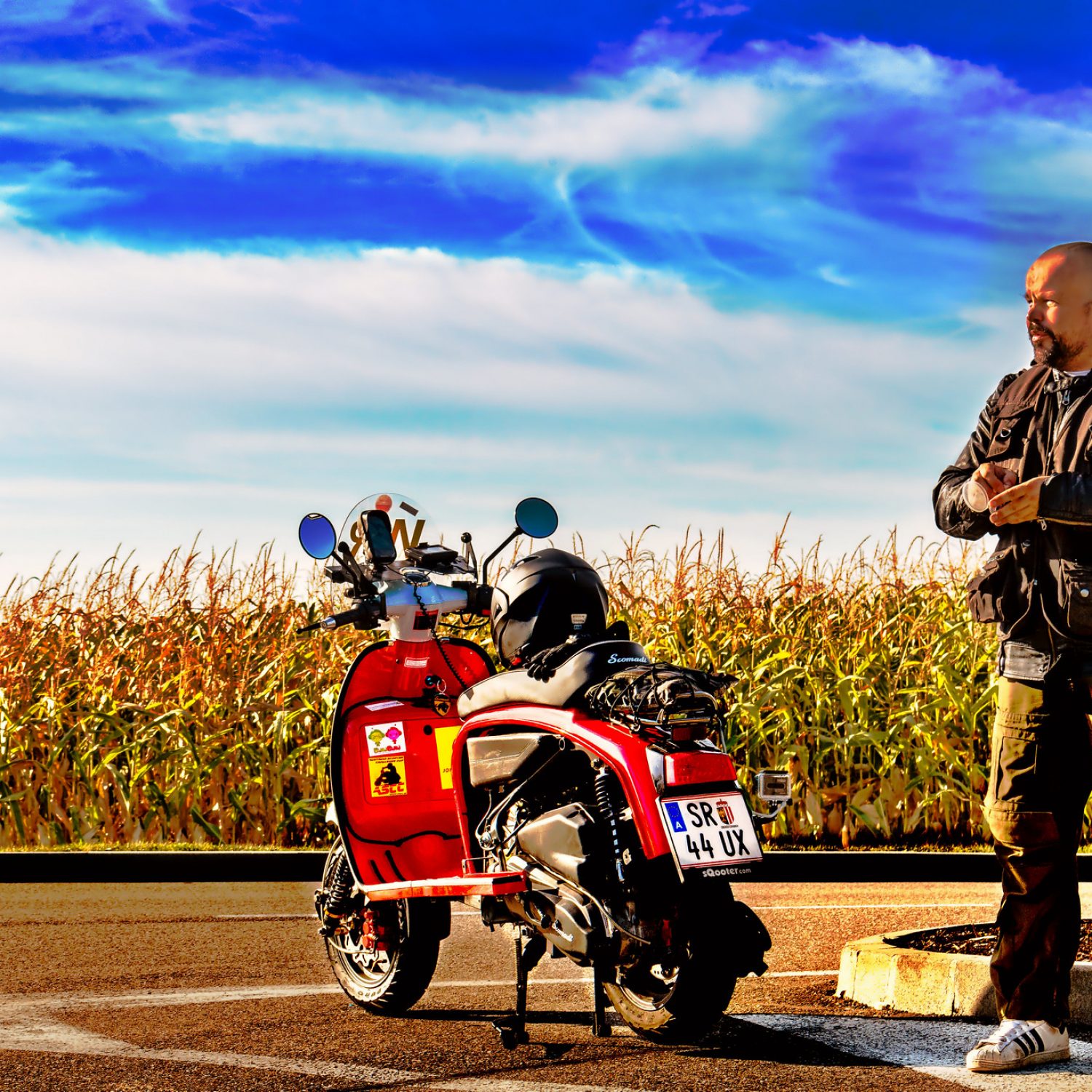 Since I was 16 I was absolutely hooked on classic Vespa and Lambretta Scooters. Back then it was my only way to move around. I lived in rural Bavaria and public transport was scarce and bad. I have also always been a bit of an adrenaline junkie! I started Bungee Jumping, became a Paratrooper later, and also went diving with sharks and such. Since that time I always had a minimum of one scooter in the house and in 2014 I started long-distance travel on classic Vespas and PiaggioApe.